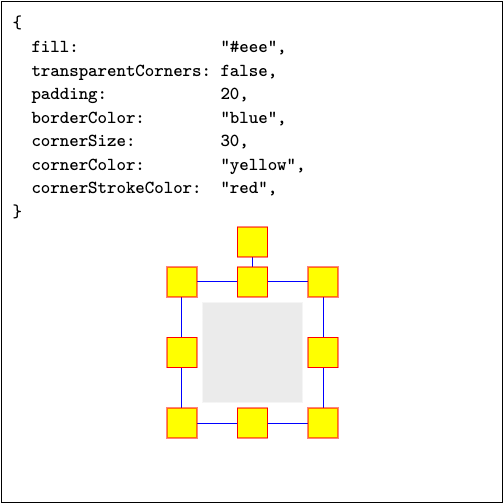 这里我想多说一点,一般来讲,像这种上层的交互功能,做为一个 Canvas 库通常是不会封装好的。 但是 fabric.js 却帮我们做好了,这也验证了它自己定义里面的一个关键词:** 可交互的**,正是因为它通过边角控制器封装了可见的对象操作,才使得 Canvas 对象可以与用户进行交互。我们普通开发者不需要关心细节,配置一些通用参数就能实现功能。