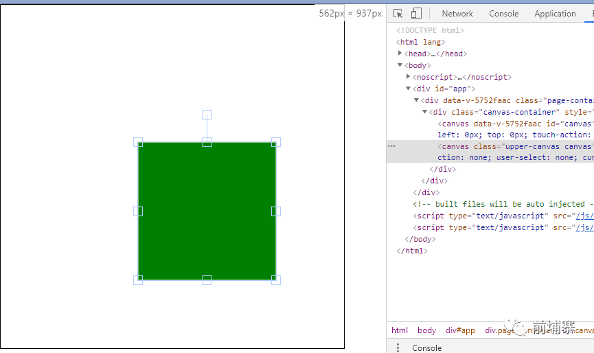 矩形 //引入fabric import { fabric } from "fabric"; // 创建一个fabric实例 let canvas = new fabric.Canvas("canvas"); //可以通过鼠标方法缩小,旋转 // or // let canvas = new fabric.StaticCanvas("canvas"); //没有鼠标交互的fabric对象 // 创建一个矩形对象 let rect = new fabric.Rect({ left: 200, //距离左边的距离 top: 200, //距离上边的距离 fill: "green", //填充的颜色 width: 200, //矩形宽度 height: 200, //矩形高度 }); // 将矩形添加到canvas画布上 canvas.add(rect); 可以看到界面中填充了一个可以通过鼠标放大缩小且可以旋转的绿色矩形