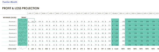 现在,我们可以添加迷你图来匹配其他数据行。为此,我们需要提供一系列单元格以从中获取数据以及迷你图的一些设置。在这种情况下,我们可以指定: