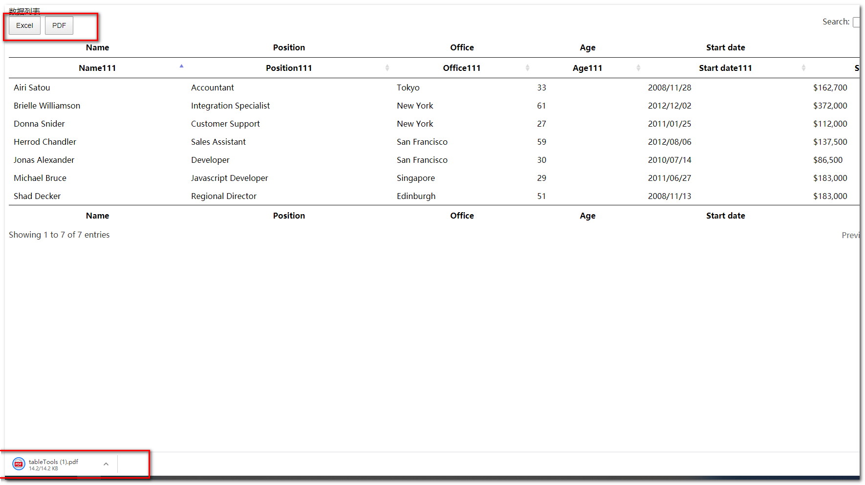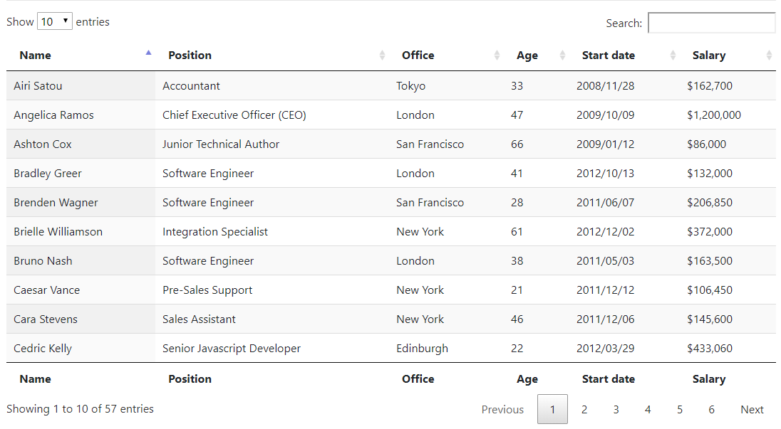 <table id="myTable" class="display" style="width:100%"> <thead> <tr> <th>Name</th> <th>Position</th> <th>Office</th> <th>Age</th> <th>Start date</th> <th>Salary</th> </tr> </thead> <tbody> <tr> <td>Ops Coffee</td> <td>System Architect</td> <td>Edinburgh</td> <td>18</td> <td>2011/04/25</td> <td>$320,800</td> </tr> <!-- 中间省略一些tr数据 --> <tr> <td>Donna Snider</td> <td>Customer Support</td> <td>New York</td> <td>27</td> <td>2011/01/25</td> <td>$112,000</td> </tr> </tbody> <tfoot> <tr> <th>Name</th> <th>Position</th> <th>Office</th> <th>Age</th> <th>Start date</th> <th>Salary</th> </tr> </tfoot></table> $(document).ready( function () { $('#myTable').DataTable(); });