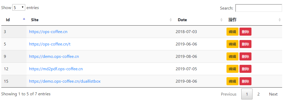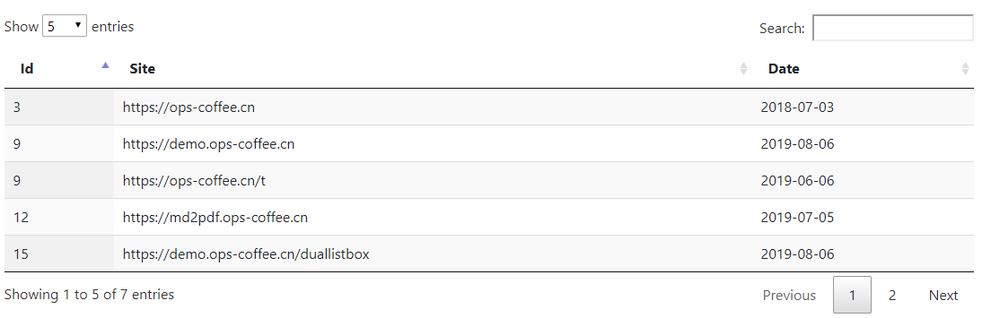 功能开启/关闭默认界面下除了原始的table外,还为table额外增加了搜索、列排序、分页及信息显示这些内容,如果不需要其中一个或多个可以通过以下设置隐藏 $('#myTable').DataTable({ "paging": false, "ordering": false, "info": false, "searching": false, }); paging: 控制分页是否开启,默认开启,开启后会显示表格左上角的每页行数选择和右下角的页码跳转 ordering: 控制是否进行排序,默认开启,且默认会对第一列数据进行排序 info: 控制是否显示表格左下角的信息,默认开启 searching: 控制是否显示表格右上角的搜索,默认开启 排序配置单列排序可以通过 "order": [[ 3, "desc" ]], 列号默认从0开始算起,这里的3实际上对应的是第4列,这点要注意,以下所有用到列号的地方都是从0开始 注意:开启 多列排序当然也可以在order里边配置同时按多列排序 "order": [[ 3, "desc" ], [ 0, "desc" ]], 如上配置的意思是先按照3列进行排序,如果3列相同,则再按照0列进行排序 搜索框提示设置"fnPreDrawCallback": function( oSettings ) { $('.dataTables_filter input').attr({'name':'search','placeholder': '按名称搜索'});//提示}, 屏蔽错误提示和自定义错误提示官方参考:https://datatables.net/reference/event/error //初始化之前设置$.fn.dataTable.ext.errMode = 'none'; //屏蔽掉报错弹窗 $('#Table')//初始化的datatables .on( 'error.dt', function ( e, settings, techNote, message ) { //接收并打印错误信息,也可自行添加相应处理方法 console.log( 'An error has been reported by DataTables: ', message ); } ).DataTable({ //其他配置 }); 隐藏列可以通过 "columnDefs": [ { "targets": [ 2 ], "visible": false, "searchable": false }, { "targets": [ 3 ], "visible": false, }] targets: 指定列 visible: 是否可显示 searchable: 是否可搜索,当仅设置 注意:开启 动态隐藏列/** * #tagTable 表格id * column(5) 第6列 * visible(false) true 显示 false不显示 */$('#tagTable').DataTable().column(5).visible(false); 语言配置默认提示语都是英文,可以通过 "language": { "decimal": "", "emptyTable": "表中数据为空", "info": "显示第 _START_ 至 _END_ 项结果,共 _TOTAL_ 项", "infoEmpty": "显示第 0 至 0 项结果,共 0 项", "infoFiltered": "(由 _MAX_ 项结果过滤)", "InfoPostFix": "", "thousands": ",", "lengthMenu": "显示 _MENU_ 项结果", "loadingRecords": "载入中...", "processing": "处理中...", "search": "搜索:", "zeroRecords": "没有匹配结果", "Paginate": { "sFirst": "首页", "sPrevious": "上一页", "sNext": "下一页", "sLast": "尾页" }, "Aria": { "sSortAscending": ": 以升序排列此列", "sSortDescending": ": 以降序排列此列" } } 状态保持可以通过 "stateSave": true, 分页类型可以通过 "pagingType": "simple_numbers", simple_numbers: 类型会显示上一页、下一页按钮和页码,这也是默认的分页类型 其他几种分页类型如下: numbers: 仅显示页码 simple: 仅显示上一页、下一页按钮 full: 仅显示首页、尾页、上一页和下一页按钮 full_numbers: 显示首页、尾页、上一页、下一页按钮和页码 first_last_numbers: 显示首页、尾页按钮和页码 滚动配置当table的宽、高超过页面设置大小时,可以通过以下配置来添加滚动条 "scrollX": "true","scrollY": "200px","scrollCollapse": true, scrollX: 允许水平滚动条 scrollY: 设置垂直body的高度,当超过这个这个高度时出现垂直滚动条 scrollCollapse: 设置当数据占用高度小于 数据加载上篇文章中的所有数据都是直接渲染的html中的table数据,datatables还支持其他几种数据源,以方便实现更灵活的控制 从数组中获取<table id="myTable-x" class="display" style="width:100%"></table> $(document).ready(function() { var dataSet = [ ["3","https://ops-coffee.cn","2018-07-03"], ["9","https://demo.ops-coffee.cn", "2019-08-06"], ]; $('#myTable-x').DataTable({ "data": dataSet, "columns": [ { title: "Id" }, { title: "Site" }, { title: "Date" }, ] }) }); data: 指定数组 columns: 配置每一列的title 注意:从数组中获取数据一定要有表头,如果没有则可能会报下边的错: Uncaught TypeError: Cannot read property 'aDataSort' of undefined 解决方法就是datatables添加 <table id="myTable-x" class="display" style="width:100%"> <thead> <tr> <th>ID</th> <th>Site</th> <th>Date</th> </tr> </thead></table> 从对象中获取<table id="myTable-x" class="display" style="width:100%"></table> $(document).ready(function() { var dataSet = [ {"Id":"3","Site":"https://ops-coffee.cn","Date":"2018-07-03"}, {"Id":"9","Site":"https://demo.ops-coffee.cn","Date":"2019-08-06"}, ]; $('#myTable-x').DataTable({ "data": dataSet, "columns": [ {"data": "Id", "title": "Id"}, {"data": "Site", "title": "Site"}, {"data": "Date", "title": "Date"}, ] }) }); 使用对象数组,一定要配置columns的 从实例中获取$(document).ready(function() { function dataSet(id, site, date) { this.id = id; this.site = site; this.date = date; }; $('#myTable-x').dataTable({ data: [ new dataSet("3", "https://ops-coffee.cn", "2018-07-03"), new dataSet("9", "https://demo.ops-coffee.cn", "2019-08-06"), ], columns: [ {"data": "id", "title":"Id"}, {"data": "site", "title":"Site"}, {"data": "date", "title":"Date"} ] }); }); Ajax异步获取Datatables还支持Ajax的方式异步加载数据,简单的方式是直接配置一个url地址即可 $(document).ready(function() { $('#myTable-x').dataTable({ "ajax": 'sdata.json' }); }); ajax接收的数据可以是数组或者对象,注意 Ajax异步刷新$('#tagTable').DataTable().reload() 直接刷新 $('#tagTable').DataTable().ajax.url() 支持新的url异步刷新 $('#tagTable').DataTable().ajax.url('{:url("index/material/listAll")}?seachClassId='+id).load(); 表格重载var table = $('#example').DataTable(); table.ajax.reload(); 或者 $('#example').DataTable().ajax.reload(); 当
