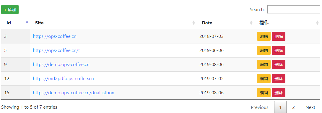 我们想把右上角的每页显示条数控件换成添加按钮的话可以这样写 $('#myTable-x').dataTable({ "dom": '<"#add-btn.toolbar">frtip'}) $("#add-btn.toolbar").html( '<button href="#add" class="btn btn-success btn-sm"> + 添加</button>') 遇到样式问题,需要添加css <style type="text/css"> .toolbar {float:left}</style> 这样就完美实现了 服务器端处理Datatables支持使用服务端进行数据处理,当开启服务端数据处理后,Datatables将在页面执行分页、排序、搜索等操作时向服务端发出Ajax请求,Ajax请求会传递许多变量给服务端,服务端接收到请求后根据变量的值对数据进行处理,处理完成按照固定的格式返回给前端页面,页面对返回的数据进行渲染提供给用户查看 开启服务器模式只需要两个设置项 $('#myTable-x').dataTable({ "serverSide": true, "processing": true, "ajax": '/api/site/data'}) serverSide: 为true时表示开启服务端处理模式 processing: 为true时会开启数据处理中的提示,非必须 ajax: 指定服务器端的地址,可以像上边一样是个字符串,也可以像jQuery.ajax一样作为一个对象使用,例如我想传递额外的参数(datatables默认会给后端传递许多的参数,下边有讲)给后端服务器的话,可以这样用 $('#myTable-x').dataTable({ "serverSide": true, "processing": true, "ajax": { "url": "/api/site/data", "data": function (d) { d.type = 'ops-coffee'; } } }) data: 可以在发送请求给后端时额外增加 发送到服务器端的参数当开启服务端数据处理后,默认会给服务端传递许多参数,大概如下: draw:绘制计数器,主要用来确保Ajax从服务器端接收到的数据是对应同一次请求的 start:第一条数据的起始位置 length:每页显示的条数 search[value]:全局的检索关键字order[i][column]:告诉服务器哪些列是需要排序的,i为排序列的序号,下边的i相同含义,注意i是从0开始的order[i][dir]:告诉服务器排序的方式"desc","asc"columns[i][data]:columns上定义的data属性值columns[i][name]:columns上定义的name属性值columns[i][searchable]:告诉服务器哪些列可以被搜索columns[i][orderable]:告诉服务器哪些列可以进行排序columns[i][search][value]:告诉服务器某些列的具体搜索条件 如果需要后台分页,那么需要拿到 如果有搜索的内容,那么需要拿到 服务端返回数据的格式服务端需要返回datatables可以处理的数据格式,具体数据格式如下: { "draw": 1, "recordsTotal": 7, "recordsFiltered": 7, "data": [ { "id": 3, "site": "https://ops-coffee.cn", "date": "2018-07-03" }, { "id": 9, "site": "https://demo.ops-coffee.cn", "date": "2019-08-06" } // 省略其他结果 ]} draw: 客户端调用服务端次数标识,客户端传过来是什么原样返回回去即可,无需修改 recordsTotal: 数据总条数,没有过滤的数据总条数 recordsFiltered: 过滤后符合要求的条数,如果没有搜索参数那么这个值与 data: 需要显示的具体数据,json格式 API调用Datatables提供了强大的API来处理表格上的数据,可以通过API添加数据到已经存在的表格,或者对已经存在的数据进行操作,API的类型非常丰富,详细的信息可以查阅官网,使用方法如下: 跳转到页跳转到第3页: var table = $('#myTable').DataTable() table.page(2).draw(false) page(2): page为分页方法,后边的2表示跳转到第几页,可以是一个数字,也可以是 draw(false): 对表格进行重绘以实现表格更新的显示,大多数的api操作都不会直接更新在页面上,所以需要调用下 搜索某列搜索第2列包含 var tablx = $('#myTable').dataTable() tablx.api().column(1).search('https://ops-coffee.cn').draw() 首先需要注意这个例子中的API调用使用了 重新设置ajax data属性var api = $('#tagTable').dataTable().api(); //初始化的ajax data选项 $data = api.settings()[0].ajax.data; //重新设置 $data.type = '12321321'; //重载表格 api.draw(); 导出https://datatables.net/download 官方下载 导出Excel<!DOCTYPE html><html lang="en"><head> <meta charset="UTF-8"> <title>tableTools</title> <!-- jQuery --> <script type="text/javascript" charset="utf8" src="http://code.jquery.com/jquery-1.10.2.min.js"></script> <!--datatables 的样式和导出excel的js--> <link rel="stylesheet" type="text/css" href="https://cdn.datatables.net/v/dt/jszip-2.5.0/dt-1.10.21/b-1.6.2/b-flash-1.6.2/b-html5-1.6.2/datatables.min.css"/> <script type="text/javascript" src="https://cdn.datatables.net/v/dt/jszip-2.5.0/dt-1.10.21/b-1.6.2/b-flash-1.6.2/b-html5-1.6.2/datatables.min.js"></script> <script> $(document).ready(function () { $('#myTable').DataTable({ dom: 'Bfrtip', buttons: [ 'excelHtml5', ] }); }); </script></head><body><div class="col-md-12 col-sm-12"> <!-- BEGIN EXAMPLE TABLE PORTLET--> <div class="portlet box blue-hoki"> <div class="portlet-title"> <div class="caption"> <i class="fa fa-list"></i>数据列表 </div> <div class="tools"> </div> </div> <div class="portlet-body"> <table id="myTable" class="table table-striped table-bordered table-hover" style="width:100%"> <thead> <tr> <th>Name</th> <th>Position</th> <th>Office</th> <th>Age</th> <th>Start date</th> <th>Salary</th> </tr> <tr> <th>Name111</th> <th>Position111</th> <th>Office111</th> <th>Age111</th> <th>Start date111</th> <th>Salary111</th> </tr> </thead> <tbody> <tr> <td>Airi Satou</td> <td>Accountant</td> <td>Tokyo</td> <td>33</td> <td>2008/11/28</td> <td>$162,700</td> </tr> <tr> <td>Brielle Williamson</td> <td>Integration Specialist</td> <td>New York</td> <td>61</td> <td>2012/12/02</td> <td>$372,000</td> </tr> <tr> <td>Herrod Chandler</td> <td>Sales Assistant</td> <td>San Francisco</td> <td>59</td> <td>2012/08/06</td> <td>$137,500</td> </tr> <tr> <td>Jonas Alexander</td> <td>Developer</td> <td>San Francisco</td> <td>30</td> <td>2010/07/14</td> <td>$86,500</td> </tr> <tr> <td>Shad Decker</td> <td>Regional Director</td> <td>Edinbu