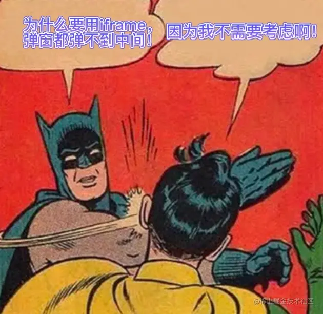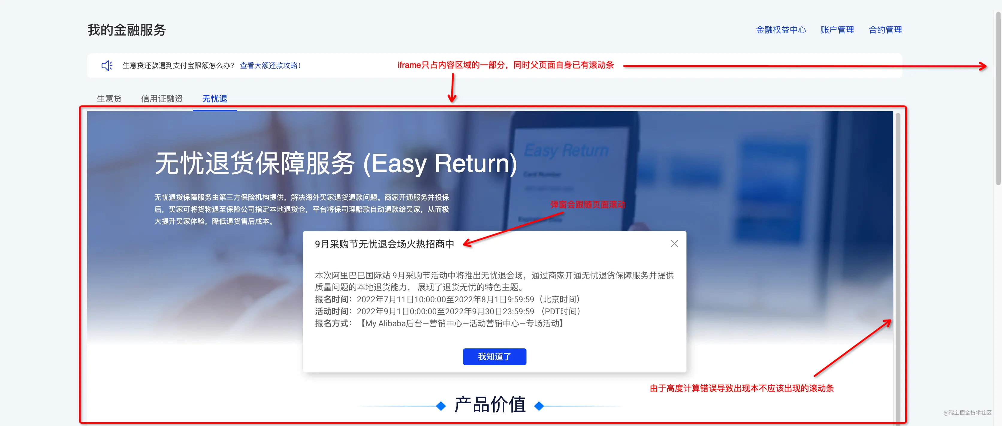 前言最近几年微前端很火,火到有时候项目里面用到了iframe还要偷偷摸摸地藏起来生怕被别人知道了,因为担心被人质疑:你为什么不用微前端方案?直到最近笔者接手一个项目,需要将现有的一个系统整体嵌入到另外一个系统(一共20多个页面),在被微前端坑了几次之后,回过头发现,iframe真香! qiankun的作者有一篇《Why Not Iframe》 介绍了iframe的优缺点(不过作者还有一篇《你可能并不需要微前端》给微前端降降火),诚然iframe确实存在很多缺点,但是在选择一个方案的时候还是要具体场景具体分析,它可能在当下很流行,但它不一定在任何时候都是最优解:iframe的这些缺点对我来说是否能够接受?它的缺点是否有其它方法可以弥补?使用它到底是利大于弊还是弊大于利?我们需要在优缺点之间找到一个平衡。 优缺点分析iframe适合的场景由于iframe的一些限制,部分场景并不适合用iframe,比如像下面这种iframe只占据页面中间部分区域,由于父页面已经有一个滚动条了,为了避免出现双滚动条,只能动态计算iframe的内容高度赋值给iframe,使得iframe高度完全撑满,但这样带来的问题是弹窗很难处理,如果居中的话一般弹窗都相对的是iframe内容高度而不是屏幕高度,从而导致弹窗可能看不见,如果固定弹窗top又会导致弹窗跟随页面滚动,而且稍有不慎iframe内容高度计算有一点点偏差就会出现双滚动条。 所以: