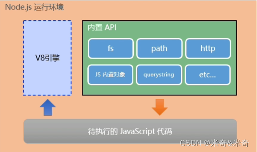 总结: V8引擎负责解析和运行Javascript代码。 内置API是由运行环境 提供的特殊接口,只能在所属的运行环境中被调用 那什么是node.js呢? 和Javascript又是什么关系呢? node.js 提供了 Javascript的运行环境。 当Javascript作为后端开发语言来说, 需要在node.js的环境上进行 当Javascript作为前端开发语言来说,需要在浏览器的环境上进行 Node.js 中的Javascript运行环境?(后端开发) Node.js是一个基于Chrome V8引擎的Javascript 运行环境 (Chrome V8引擎运行效率最高) 如果我们写了一段js代码,把它放在浏览器中运行,那么我们在做前端开发。 如果我们写了一段js代码,把它放在node中运行,那么我们在做后端开发。 总结: