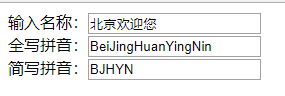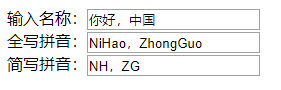 <body> <div> 输入名称:<input type="text" id="chinaName" onBlur="ConvertName()" /> <br/> 全写拼音:<input type="text" id="fullName" /> <br/> 简写拼音:<input type="text" id="easyName" /> <br/> </div> </body>