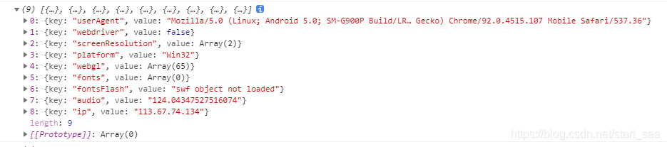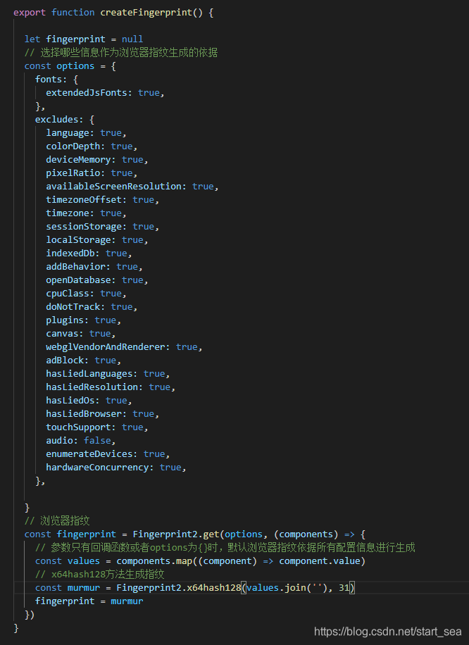 excludes内包含的字段参数即生成的指纹不包括的内容,console.log() Fingerprint2.get()方法中的components可以看到获取的内容。