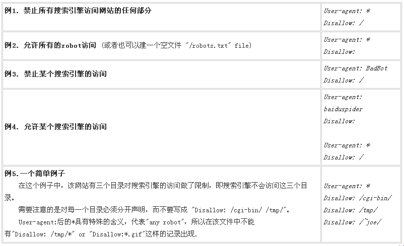 搜索引擎通过一种程序robot(又称spider),自动访问互联网上的网页并获取网页信息。 您可以在您的网站中创建一个纯文本文件robots.txt,在这个文件中声明该网站中不想被robot访问的部分,这样,该网站的部分或全部内容就可以不被搜索引擎收录了,或者指定搜索引擎只收录指定的内容。 2.robots.txt文件放在哪里? robots.txt文件应该放在网站根目录下。举例来说,当robots访问一个网站(比如http://www.abc.com)时,首先会检查该网站中是否存在http://www.abc.com/robots.txt这个文件,如果机器人找到这个文件,它就会根据这个文件的内容,来确定它访问权限的范围。 3.robots.txt文件的格式 "robots.txt"文件包含一条或更多的记录,这些记录通过空行分开(以CR,CR/NL, or NL作为结束符),每一条记录的格式如下所示: " 在该文件中可以使用#进行注解,具体使用方法和UNIX中的惯例一样。该文件中的记录通常以一行或多行User-agent开始,后面加上若干Disallow行,详细情况如下: User-agent: 该项的值用于描述搜索引擎robot的名字,在"robots.txt"文件中,如果有多条User-agent记录说明有多个robot会受到该协议的限制,对该文件来说,至少要有一条User-agent记录。如果该项的值设为*,则该协议对任何机器人均有效,在"robots.txt"文件中,"User-agent:*"这样的记录只能有一条。 Disallow: 该项的值用于描述不希望被访问到的一个URL,这个URL可以是一条完整的路径,也可以是部分的,任何以Disallow开头的URL均不会被robot访问到。例如"Disallow:/help"对/help.html 和/help/index.html都不允许搜索引擎访问,而"Disallow:/help/"则允许robot访问/help.html,而不能访问/help/index.html。任何一条Disallow记录为空,说明该网站的所有部分都允许被访问,在"/robots.txt"文件中,至少要有一条Disallow记录。如果"/robots.txt"是一个空文件,则对于所有的搜索引擎robot,该网站都是开放的。 4.robots.txt文件用法举例 ![]() 该文章在 2011/3/14 16:36:58 编辑过 |