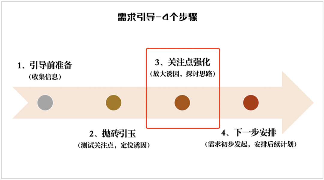 以上,就是本节对于关注点强化这一环节,以及4C强化框架的介绍。究竟什么是关注点强化?如果,你发现客户的锅里有个小洞,你要做的就是拿个锤子去敲一敲,把小洞敲大,然后在此基础上给客户一个补锅的方案。你可能会担心:把小洞敲大,会不会不道德?你想多了,如果小洞旁边没腐化,你压根就敲不大。你没有坑他,你是在帮他!