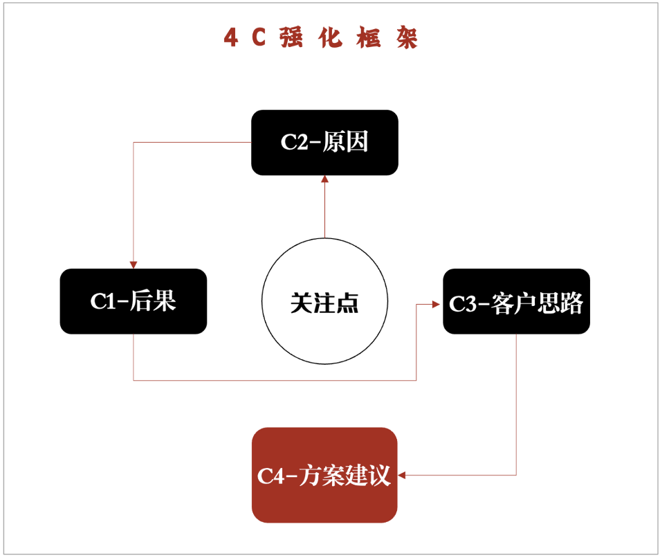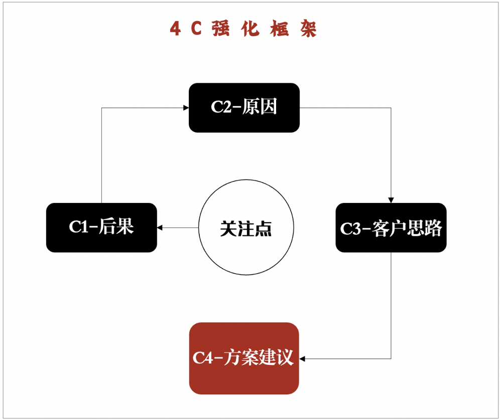 我们不妨来分析一下。在“抛砖引玉”环节,销售人员洞察到了客户的“关注点”(输入要素)。而“关注点强化”这一环节的目标,是导向销售人员提供的“方案”(输出要素)。那么,这一环节要做的,就是在“客户的关注点”与“销售人员的方案”之间,搭起一座桥梁。基于我十多年的销售经验,曾引导过无数需求,对此我整理了一套实用的方法——4C强化框架它遵循着一条清晰的引导路径,从客户的“关注点"出发:1、探讨关注点(例如某问题)所导致的“后果”——Consequence2、探讨关注点产生的“原因”——Cause3、了解“客户的目前思路和措施”——Customer Mind4、最后再提出“方案建议”——Counsel接下来,我们来详细看看“4C强化框架”的各个环节。