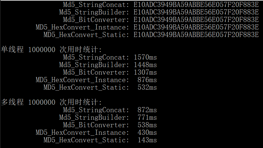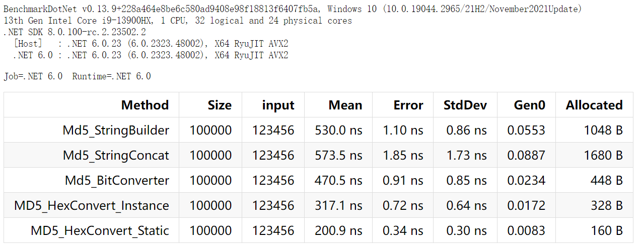 • 强烈建议 使用 MD5.HashData + Convert.ToHexString, 代码性能最高,也最简洁,只有 3 行