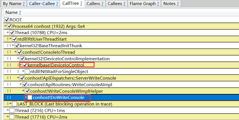 一:背景1. 讲故事在分析旅程中,总会有几例控制台的意外卡死导致的生产事故,有经验的朋友都知道,控制台卡死一般是动了 虽然知道缘由,但一直没有时间探究底层原理,市面上也没有对这块的底层原理介绍,昨天花了点时间简单探究了下,算是记录分享吧。 二:几个疑问解答1. 界面为什么会卡死相信有很多朋友会有这么一个疑问?控制台程序明明没有 说实话这是一个好问题,其实 Console 之所以能响应 窗口事件,是因为它开了一个配套的 conhost 窗口子进程,用它来承接 UI 事件,为了方便阐述,上一段定时向控制台输出的测试代码。 static void Main(string[] args) { for (int i = 0; i < int.MaxValue; i++) { Console.WriteLine($"i={i}"); Thread.Sleep(1000); } } 将程序跑起来,再用 process explorer 观察进程树即可。 接下来用 windbg 附加到 conshost 进程上,观察下有没有 0:005> ~* k 0 Id: 3ec8.2c20 Suspend: 1 Teb: 000000d2`92014000 Unfrozen # Child-SP RetAddr Call Site 00 000000d2`922ff798 00007fff`a3e45746 ntdll!NtWaitForSingleObject+0x14 01 000000d2`922ff7a0 00007fff`a60b5bf1 KERNELBASE!DeviceIoControl+0x86 02 000000d2`922ff810 00007ff6`9087a790 KERNEL32!DeviceIoControlImplementation+0x81 03 000000d2`922ff860 00007fff`a60b7614 conhost!ConsoleIoThread+0xd0 04 000000d2`922ff9e0 00007fff`a66a26a1 KERNEL32!BaseThreadInitThunk+0x14 05 000000d2`922ffa10 00000000`00000000 ntdll!RtlUserThreadStart+0x21 ... 2 Id: 3ec8.1b70 Suspend: 1 Teb: 000000d2`9201c000 Unfrozen # Child-SP RetAddr Call Site 00 000000d2`9227f858 00007fff`a4891b9e win32u!NtUserGetMessage+0x14 01 000000d2`9227f860 00007ff6`908735c5 user32!GetMessageW+0x2e 02 000000d2`9227f8c0 00007fff`a60b7614 conhost!ConsoleInputThreadProcWin32+0x75 03 000000d2`9227f920 00007fff`a66a26a1 KERNEL32!BaseThreadInitThunk+0x14 04 000000d2`9227f950 00000000`00000000 ntdll!RtlUserThreadStart+0x21 ... 2. 进程间如何通讯这个问题再细化一点就是Client 端通过 熟悉 Windows 编程的朋友都知道:Console.WriteLine 的底层调用逻辑是 说了这么多,怎么去验证呢?