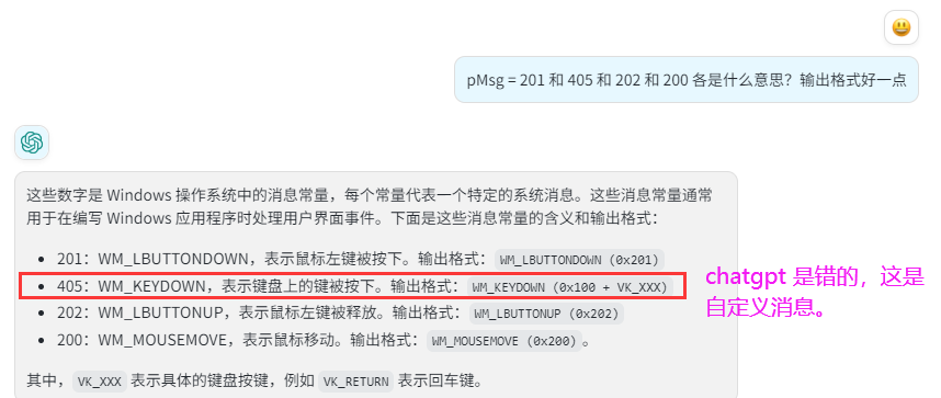 接下来可以验证下 0:004> bp win32u!NtUserGetMessage "dp ebp-30 L2 ; g" 0:004> g 00000095`d61ffae0 00000000`00130e6e 00000000`00000404 00000095`d61ffae0 00000000`00130e6e 00000000`00000404 00000095`d61ffae0 00000000`00130e6e 00000000`00000201 00000095`d61ffae0 00000000`00130e6e 00000000`00000405 00000095`d61ffae0 00000000`00130e6e 00000000`00000202 00000095`d61ffae0 00000000`00130e6e 00000000`00000200 从 chaggpt 中对每个消息码的介绍,可以看到会有一个 405 的自定义消息,这个就是和 三:总结这篇就是我个人对窗口卡死的推测和记录,高级调试不易,如果大家感兴趣,欢迎补充细节。 作者:一线码农 来源:博客园 该文章在 2023/10/28 10:15:11 编辑过 |