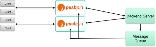 最基本的设置是将Pushpin放在典型的Web服务后端前面,后端将数据直接发布到Pushpin。Web服务本身可能会发布数据以响应传入的请求,或者可能存在某种发布数据的后台进程/作业。