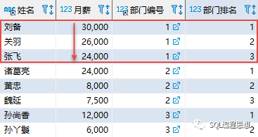 前 3 行数据的部门编号都为 1;“刘备”的月薪最高,在部门内排名第一;“关羽”排名第二;“张飞”排名第三。其他部门的数据采用同样的方式进行计算。