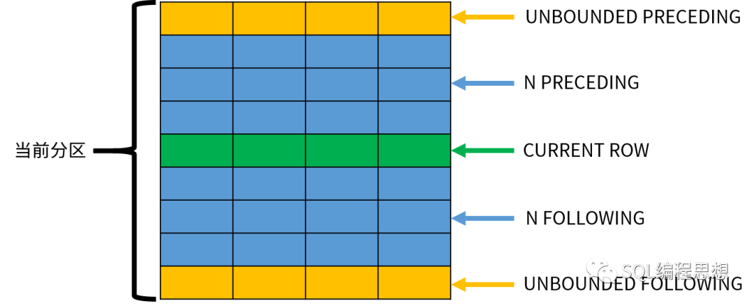 表示当前正在处理的行;其他的行可以使用相对当前行的位置表示。需要注意,窗口的大小不会超出当前分区的范围。