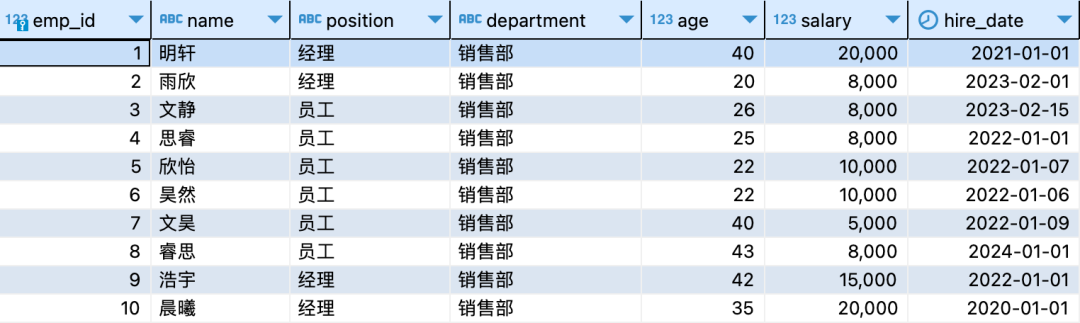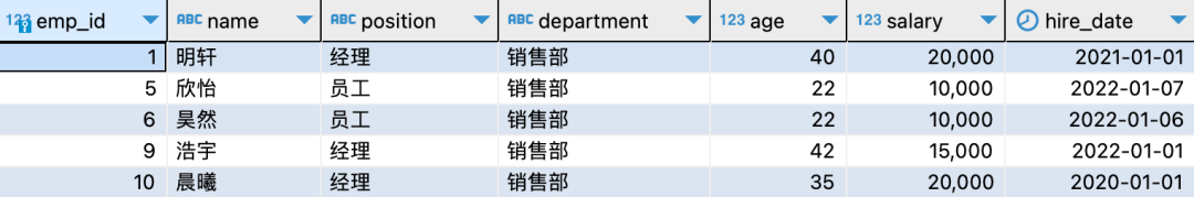 子查询是SQL查询中一个强大的工具,它允许我们将一个查询语句嵌套在另一个查询语句中,从而执行更为复杂的数据检索操作。在子查询的结构中,通常将外层的查询称为主查询,而被嵌套在内的查询则称为子查询。子查询的结果往往作为主查询的条件来使用,使用时需要用括号将其括起来。 子查询不仅可以在WHERE子句中使用,以过滤主查询的结果,还可以灵活地应用于SELECT、FROM、HAVING等子句中,从而提供更为细致和灵活的数据处理功能。这使得子查询在处理复杂数据查询需求时显得尤为有用,尤其是在面对SQL自身语法限制时,子查询往往能够成为解决问题的关键所在。 测试数据如下: 01. WHERE子句中使用子查询 在SQL查询中,子查询是嵌套于其他查询中的独立查询。执行时,系统会先计算子查询并返回结果,通常与WHERE子句结合使用,作为筛选条件,以实现复杂而精准的数据检索。 倘若,我们想要查找工资比文静高的所有员工,首选我们需要找到文静的工资