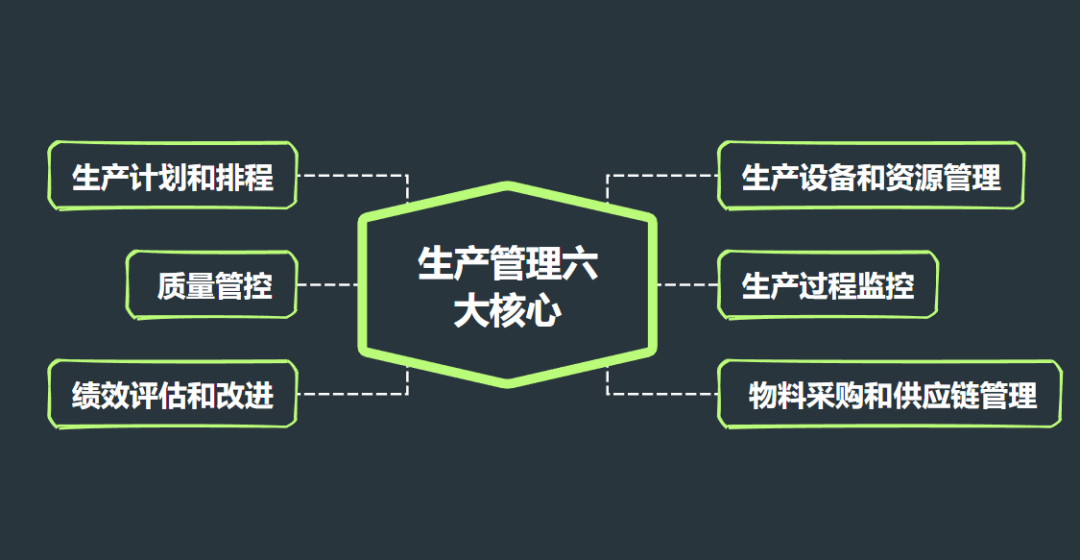 生产管理涉及到多个核心方面的活动和功能,六大核心内容有:生产计划和排程、物料采购和供应链管理、生产过程监控、生产设备和资源管理、质量管控、绩效评估和改进。