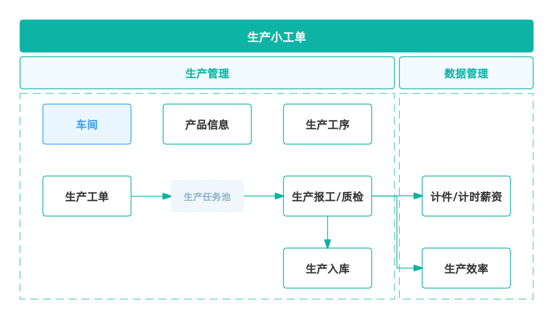 生产小工单的业务流程分为两个部分:生产管理和数据管理。生产管理包括生产工单、生产报工/质检、生产入库。数据管理包括计件/计时薪资、生产效率。