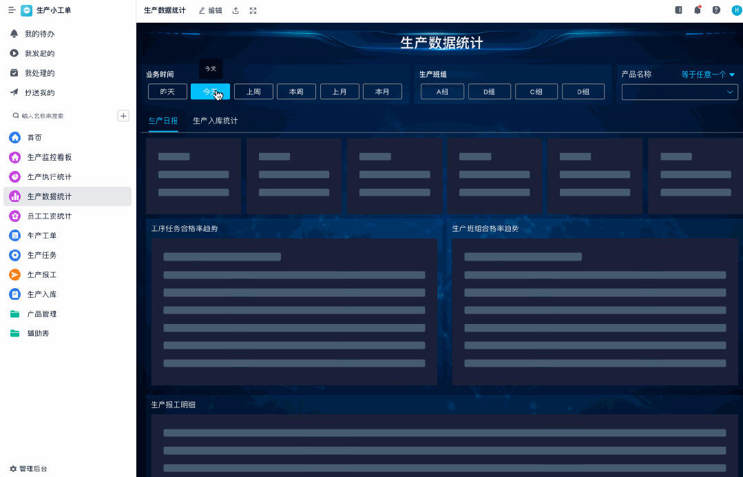 生产小工单用于生成生产日报、报工和质检数据统计,为生产管理提供数据支持和决策依据,实现生产过程的实时监控和反馈。