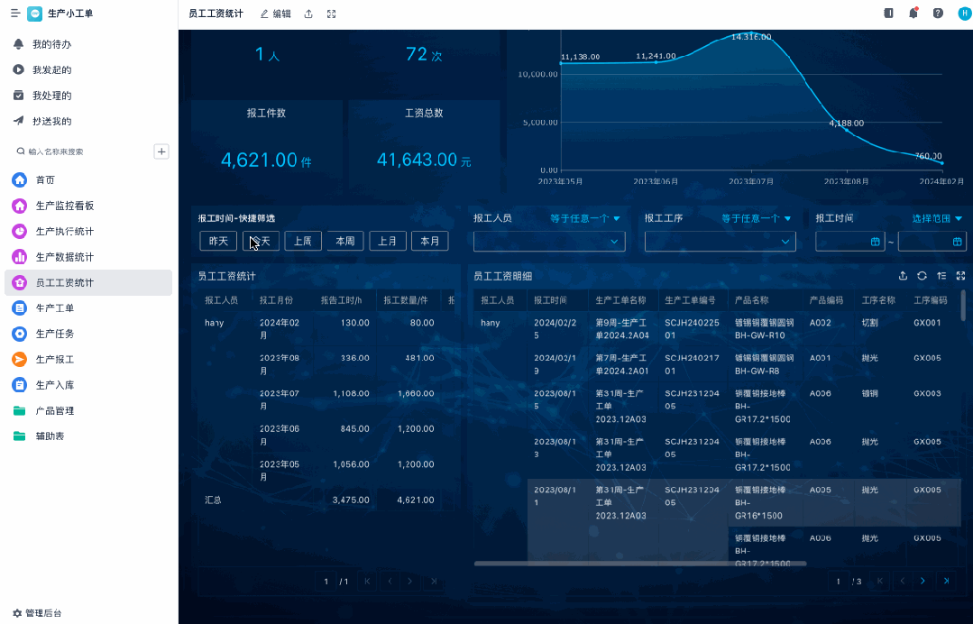 - 可以生成生产效率报表和趋势分析图表,帮助管理者了解生产情况并进行改进措施。