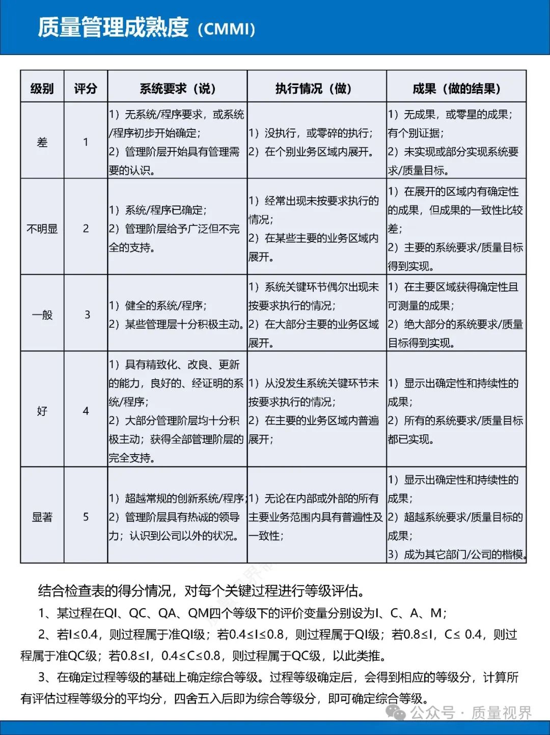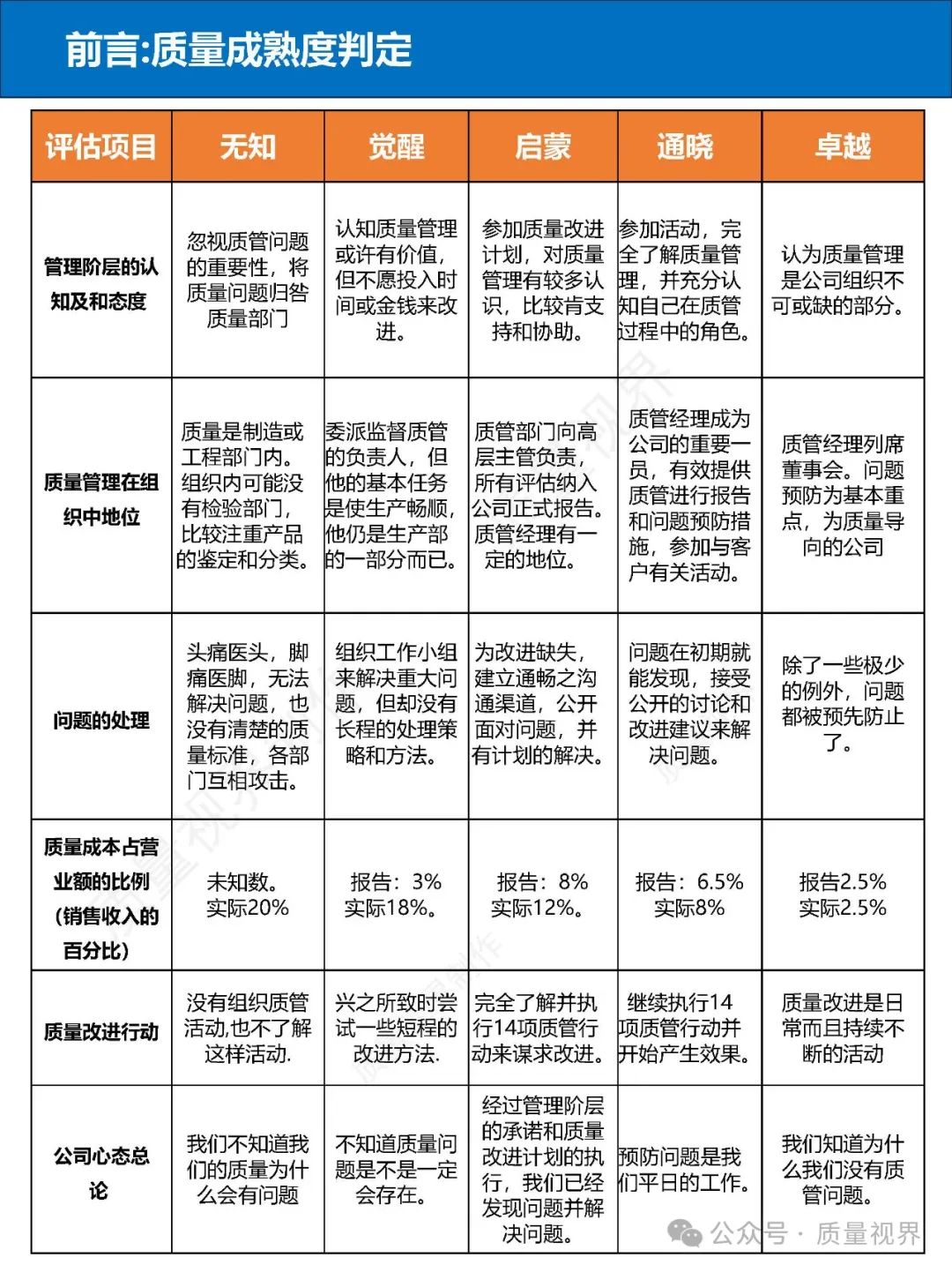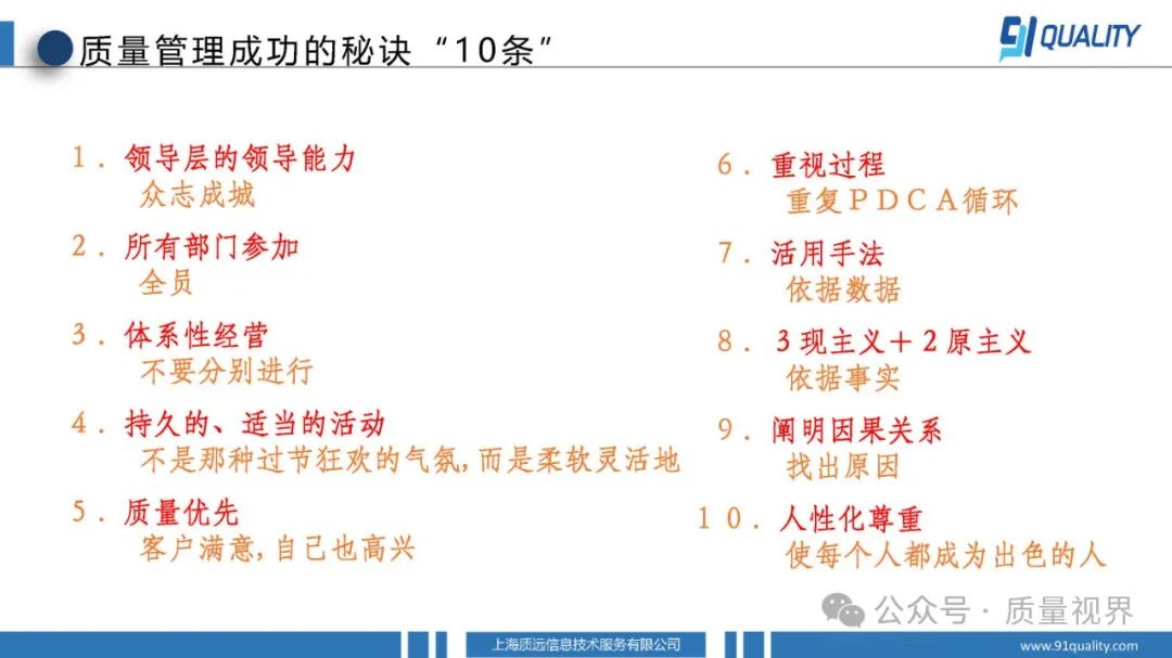 在当今竞争激烈、市场环境瞬息万变的商业版图中,产品与服务质量宛如企业的生命线,牢牢把控着企业兴衰存亡的命脉。而处于质量管理核心位置的质量人,肩负着保障质量水准、推动质量提升的重任,在这场质量捍卫战里,系统思维成为其不可或缺的 “秘密武器”。本文介绍质量管理4个等级、7大原则、10个基本思维方式、12个步骤、15个基本原理,每一条都是管理精髓。 01 质量的4个等级 02 质量管理的7大原则 质量管理的七大原则是以顾客为关注焦点、领导作用、全员参与、过程方法、改进、循证决策、关系管理 ,以下是对这些原则的详细阐述: 1、以顾客为关注焦点:深入了解顾客需求,包括潜在需求。例如苹果公司通过不断创新产品功能和提升用户体验,满足了消费者对于便捷、高效和高品质电子产品的需求。确保组织的目标与顾客需求和期望相结合,将顾客满意度作为衡量工作成效的重要指标。 2、领导作用:领导者要为组织制定清晰的质量方针和质量目标,指明发展方向。如华为的任正非提出了 “以客户为中心,以奋斗者为本” 的核心价值观,引领华为在全球通信和科技领域取得巨大成功。 3、全员参与:为员工提供必要的培训和资源,使他们具备相应的能力和知识,以胜任质量管理工作。比如一些制造企业会定期组织员工参加生产技能和质量管理培训课程。建立激励机制,鼓励员工积极参与质量改进活动,对表现优秀的员工给予奖励和认可。 4、过程方法:识别和确定组织内的关键过程,例如产品设计开发过程、生产制造过程、售后服务过程等。对每个过程进行策划、实施、检查和改进,即 PDCA 循环,确保过程的有效性和效率。丰田公司的生产过程管理就是过程方法的优秀典范,通过不断优化生产流程,实现了高质量和高效率的生产。 5、改进:建立持续改进的机制和文化,鼓励员工发现问题并及时提出改进建议。如海尔集团的 “日清日高” 管理模式,要求员工每天对工作进行总结和改进。运用各种质量管理工具和方法,如六西格玛、精益生产等,对组织的产品、服务和管理过程进行持续改进。 6、循证决策:收集和分析与质量管理相关的数据和信息,包括顾客反馈、生产数据、质量检测数据等。例如电商企业通过分析大量的顾客评价数据,来改进产品和服务质量。 7、关系管理:识别组织的相关方,包括供应商、合作伙伴、顾客、员工等,并建立良好的沟通和合作关系。 03 质量管理的10个基本思维方式 04 质量管理体系建立和实施的12个步骤 05 质量管理的15个基本原理 阅读原文:原文链接 点晴模切ERP更多信息:http://moqie.clicksun.cn,联系电话:4001861886 该文章在 2025/1/23 9:24:29 编辑过 |