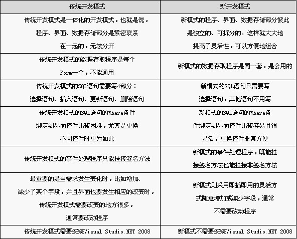 在日常应用中,大家可以看出软件开发新模式的过程与传统模式的过程相比好像无明显太大优势,都是用可视化设计过程。但是,从实际上看,两者却存在着本质的不同,它们有如下的重要差别,如下表所示。 传统开发模式与新开发模式对比 ![]() 该文章在 2012/3/20 23:11:18 编辑过 |