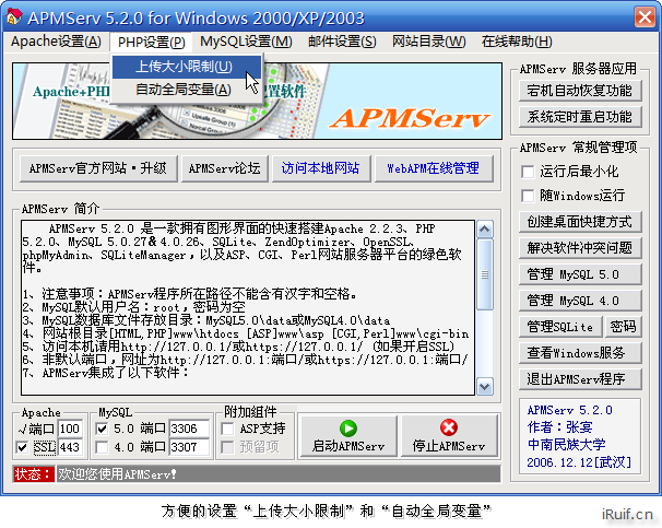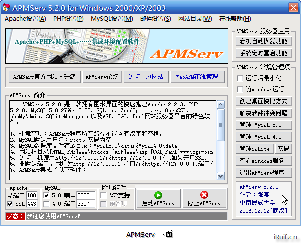 APMServ 5.2.0介绍: 语言:中文 操作系统:Windows 98/Me/2000/NT/XP/2003/Vista 作者:中南民族大学 张宴 (特别感谢!) 软件大小:14.1MB 软件性质:完全免费