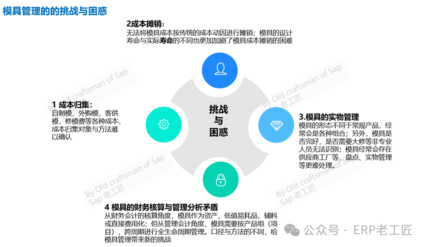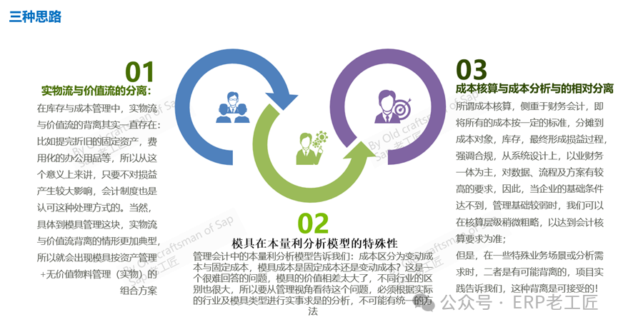 综上,由于模具不同于物料,也不同于资产,在不同的行业中,模具的成本占比大小不同,因此,模具管理是项目方案设计的难点之一,大概可以总结为以下几点:1.模具成本归集困难:自制模,外购模,客供模,修模费等各种成本,由于不是公司的主流生产,用哪种方式来归集成本是个难题,尤其是在多系统集成本数字化公司;2.模具成本摊销方法困难:模具是生产产品组件的成本组成,而一般的成本核算是以成品或半成品为成本对象,这就天然的造成了模具成本摊销的困难---无法将模具成本按传统的成本动因(Cost Driver)进行摊销;同时,模具的设计寿命与实际寿命的不同---这是模具的常态,也更加加剧了模具成本摊销的困难。3.模具的实物管理困难:模具的形态不同于常规产品,经常会是各种组合;另外,模具是否完好,是否需要大修等非专业人员无法识别;模具经常会存在供应商工厂等,盘点、实物管理等更难处理;从财务会计的核算角度,模具作为资产,低值易耗品,辅料或直接费用化;但从管理会计角度,模具需要按产品组(项目),跨周期进行全生命周期管理。口径与方法的不同,给模具管理带来新的挑战!复杂的场景,成本归集与摊销,实物管理的种种困惑,告诉我们设计流程与方案时必须面对的事实,事实上,我们没有办法设计统一的方案满足各种场景---无论技术多么先进完美,面对这类复杂的业务场景时,首先应该从管理入手,从管理视角,梳理一下管理的思路—特别是面对这种场景与需求时,必须改变的或提升的观念,然后再考虑技术实现手段。这是我解决这类复杂需求的常用方法。在库存与成本管理中,实物流与价值流的背离其实一直存在:比如提完折旧的固定资产,费用化的办公用品等,所以从这个意义上来讲,只要不对损益产生较大影响,会计制度也是认可这种处理方式的。当然,具体到模具管理这块,实物流与价值流背离的情形更加典型,所以就会出现模具按资产管理+无价值物料管理(实物)的组合方案。管理会计中的本量利分析模型告诉我们:成本区分为变动成本与固定成本,模具成本到底是属于固定成本还是变动成本?这是一个很难回答的问题,模具的价值相差太大了,不同行业的区别也很大,所以要从管理视角看待这个问题,必须根据实际的行业及模具类型进行实事求是的分析,不可能有统一的方法。成本核算(FI核算)与成本分析(CO管报)与的相对分离:所谓成本核算,侧重于财务会计,即将所有的成本按一定的标准,分摊到成本对象,库存,最终形成损益过程,强调合规,从系统设计上,以业财务一体为主,对数据、流程及方案有较高的要求,因此,当企业的基础条件达不到,管理基础较弱时,我们可以在核算层级稍微粗略,以达到会计核算要求为准。而成本分析以内部管理考核为准,按照“数据同源”的原则,数据来源应该与成本核算同维度,同口径。但是,在一些特殊业务场景或分析需求时,二者是有可能背离的,项目实践告诉我们,这种背离是可接受的! 成本分析需求在事后通过开发报表或其他技术工具方式实现。这样做,最大好处理对数据流程的依赖性有所降低,同时也基本满足了成本核算与成本分析的需求。这就是所谓的成本核算与成本分析的相对分离的概念。在考虑模具处理方案时,也有必要参考这种管理理念,问题就会变得好理解一些。甚于于以上痛点及解决思路,初步小结以下7种解决方案:方案1按固定资产管理:按套模具建立资产卡片,在资产使用期内,按月摊销折旧成本,这种情况下,折旧成本一般作为“公共”的费用,平均摊销给该产线的所有产品,一般是按机器工时分摊。这种方式,一般适用于金额较大的压铸模,注塑模等。从“成本分析”来看,这种方式,有明显的管理缺陷,模具的成本没有摊销到正确的成本对象上,摊销金额也经常背离模具的使用周期。方案2按库存物料管理+领用直接费用化:模具在入库时,作为库存物料,领用时,一次性作为费用消耗处理。这种方式仅适用于单价较小,数量众多的塑胶玻璃木质模具,这类模具大多类似于工装夹治具。事实上,为了准确分摊成本,在项目中,可能有各种变通的开发方案辅助方案3:以模具理论产出量作为库存数量,模具物料作为BOM组件,按实际的生产消耗量推算模具用量并减少库存量。优点:将模具成本摊销到对应的产品中,成本核算较准确缺点:这类物料的价值与实物料背离较大,账实不符成为常态化,适用于模具用量较大,或者模具可重复使用的情况。比如:某个模具设计理论寿命是10000次,生产产品A时,BOM抬头基本数量为1000,哪么BOM中的用量应该是0.1,按这个用量作为BOM组件,如果该模具的成本为5000元,哪么标准成本时,要分摊5000*0.1的成本,在生产订单入库时,如果该生产订单产量是3000PC,哪么要消耗的该模具数量=3000/1000*0.1=0.3,该生产订单消耗的模具成本=0.3*5000=1500.方案4 以模具理论可使用次数为(虚拟)库存数量,并作为BOM子组件搭入BOM,某模具的理论设计使用寿命为10000次,如果采购成本为5000元,哪么在采购入库时,按数量10000入库,单价=5000/10000=0.5(元/模次)在搭建BOM时,如果BOM的抬头基本数量是1000,哪么就消耗模次数量1000,标准成本应该分摊的模具成本=1000*0.5=500。同样,在生产订单入库或发料时,计算用量,如果生产订单的产量为3000,哪么应该计入订单的模具成本为3000*0.5=1500。与上述样例计算结果相同。优缺点与上述方案3类似,只是思路方法不同