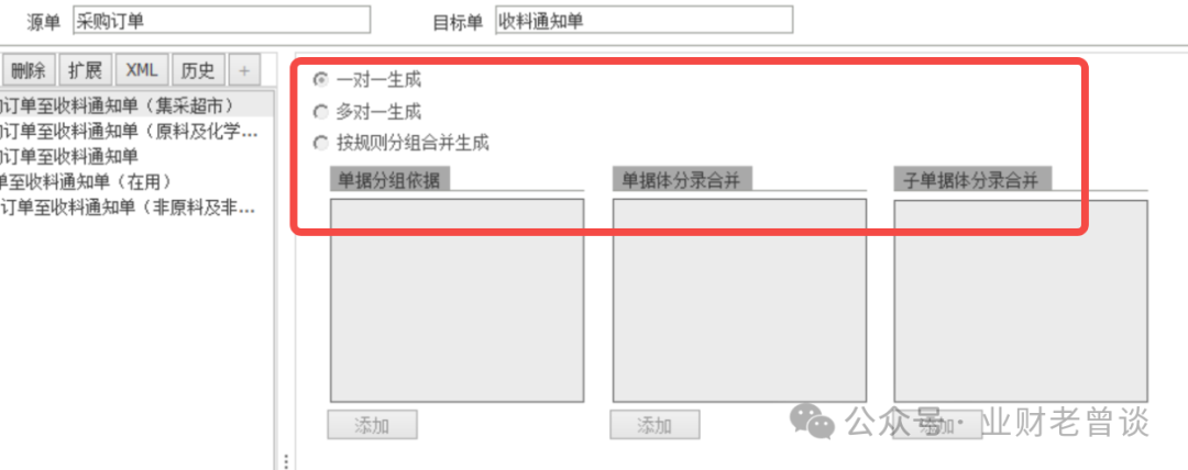 c.分组策略,配置源单批量下推生成目标单时采用的单据分组依据、分录合并依据,比如将多个《采购申请单》按同一“组织、供应商”分组(合并)生成一个目标《采购订单》 ;