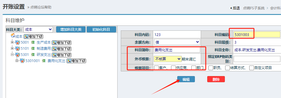 找到现在需要修改的科目,录入需要修改的信息,点击编辑按钮;