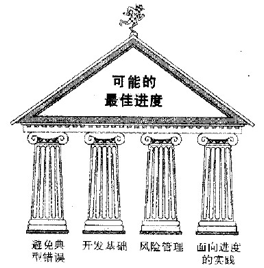 图2.1-1所示的前三根柱子为可能的最佳进度提供了最重要的支撑,虽然可能不是最理想的,但却是最需要的。也就是说,即使不借助于面向进度的实践方法,也可能实现较优化的项目进度;但是,如果仅仅依赖面向进度的实践却不可以支撑可能的最佳进度计划。
