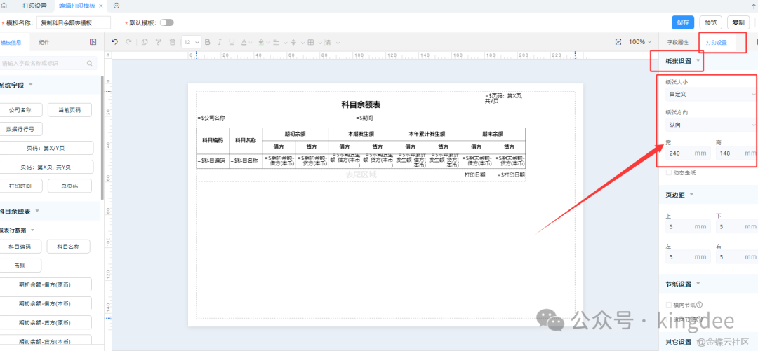 ① 自定义纸张大小。编辑界面右侧,“打印设置”中“纸张设置”选择纸张大小为“自定义”,设置纸张方向调整纸张宽高属性即可。