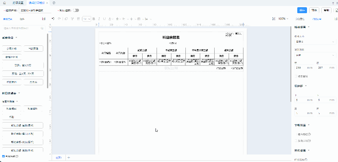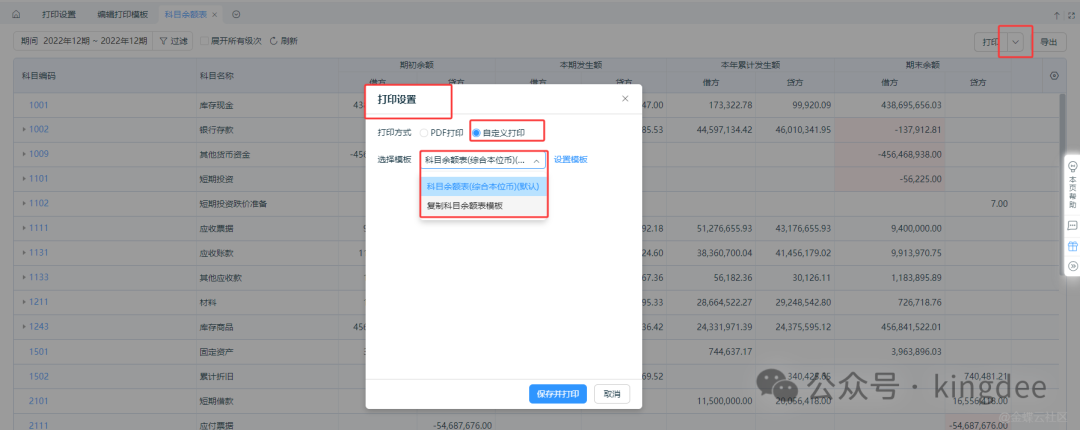 回到科目余额表界面,点击【打印】-【设置】-【自定义打印】,选择自定义的打印模板即可。