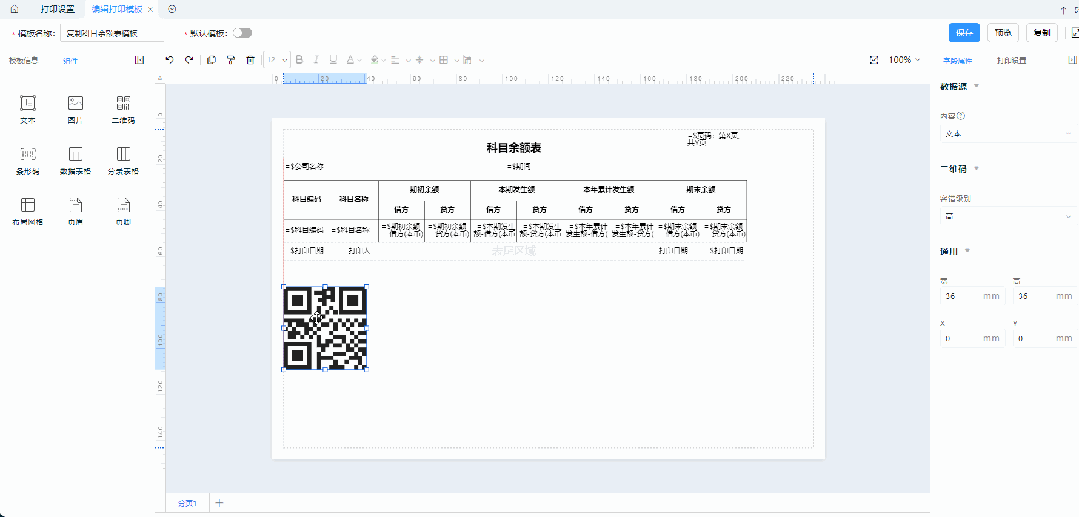 组件:基本的打印组件,必选。包含文本、图片、二维码、条形码、数据表格、分录表格、布局网格、页眉、页脚。