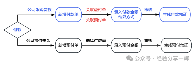 付款申请单新增--选择供应商--关联(应付单)--审批通过后(部门经理审批/财务总监审批/老板审批)--系统自动生成(付款单)