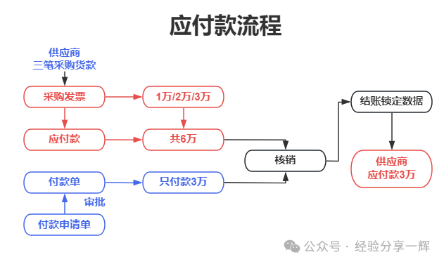 3.核销(应付单与付款单)→更新供应商应付款 ;