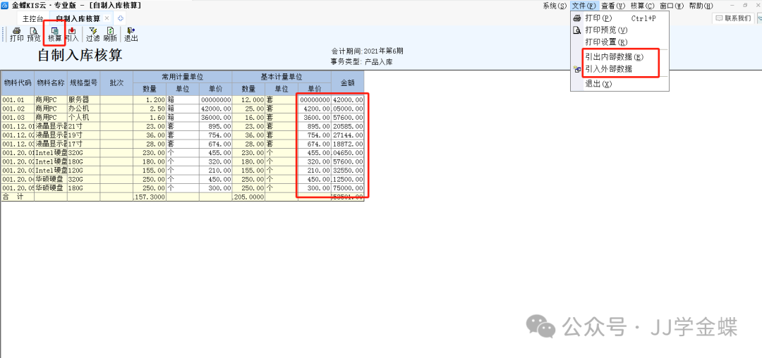 核算步骤:打开产品入库核算界面,将自制品的成本单价或金额填到对应的列后,点击左上角的“核算”,系统就会将单价反填到产品入库单里的单价列。该操作在右上角菜单栏【文件】里可以进行数据导入导出操作。