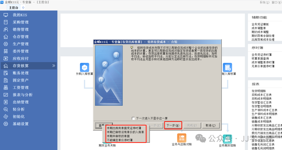 继续点击“下一步”,设置写结转报告选项,物料比较多的情况下建议勾选“只写结转有误的存货”。