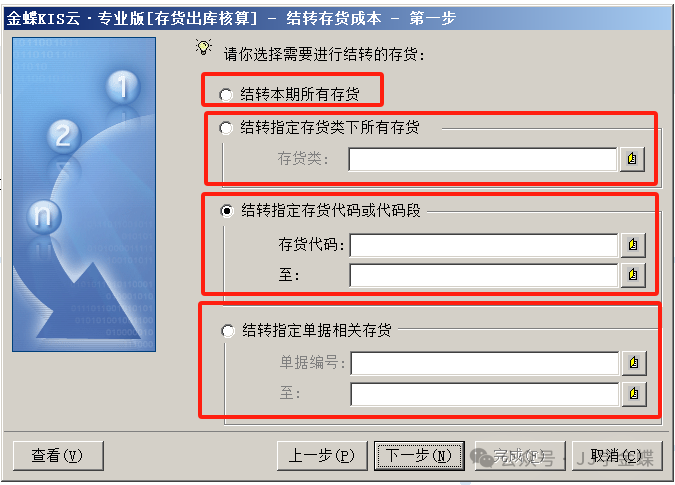 点击“下一步”,分别可以结转本期所有存货的成本、指定存货类、指定存货代码段和指定单据。省事点直接选择“结转本期所有存货”。