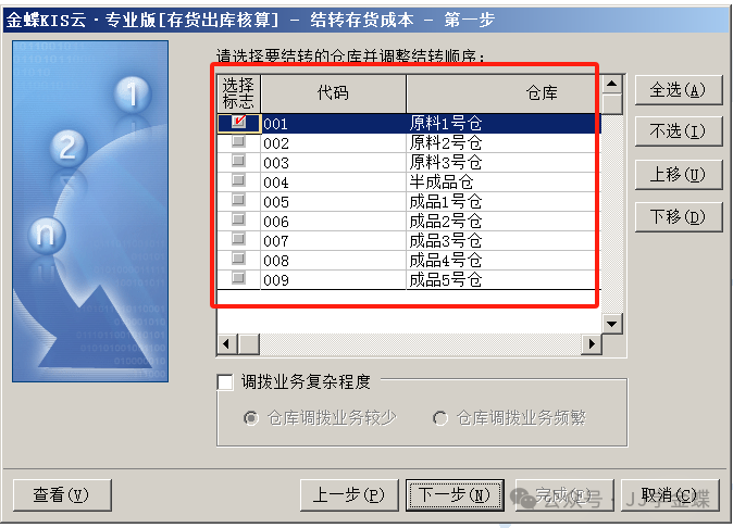 再点击“下一步”,进入选择仓库页面,选择仓库后再点击“下一步”(存货核算方式为分仓核算才有仓库选项)。
