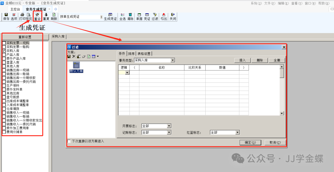 凭证生成步骤:进入业务凭证生成界面,左边选择事务类型,点击“重设”,在弹出的过滤窗口中根据情况筛选出单据,勾选单据并选择单据生成凭证的方式然后点击“生成凭证”。