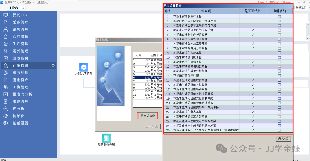 期末结账:进入期末结账界面后,点按查看按钮,先查看本期有没有不符合要求的上述现象,如有,请处理完毕后再进行结账。如果没有,则按下一步,系统会进行期末处理。如果不正确,请查看错误提示,如果正确,则系统会提示成功,状态栏中的会计期间会自动更新成新的会计期间。