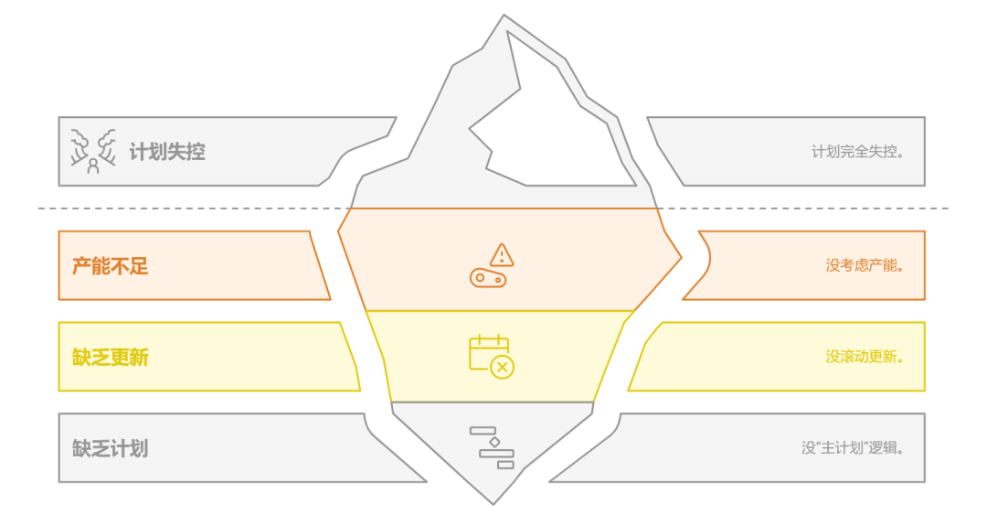 • 没“主计划”逻辑,全部靠订单追单,计划完全失控。