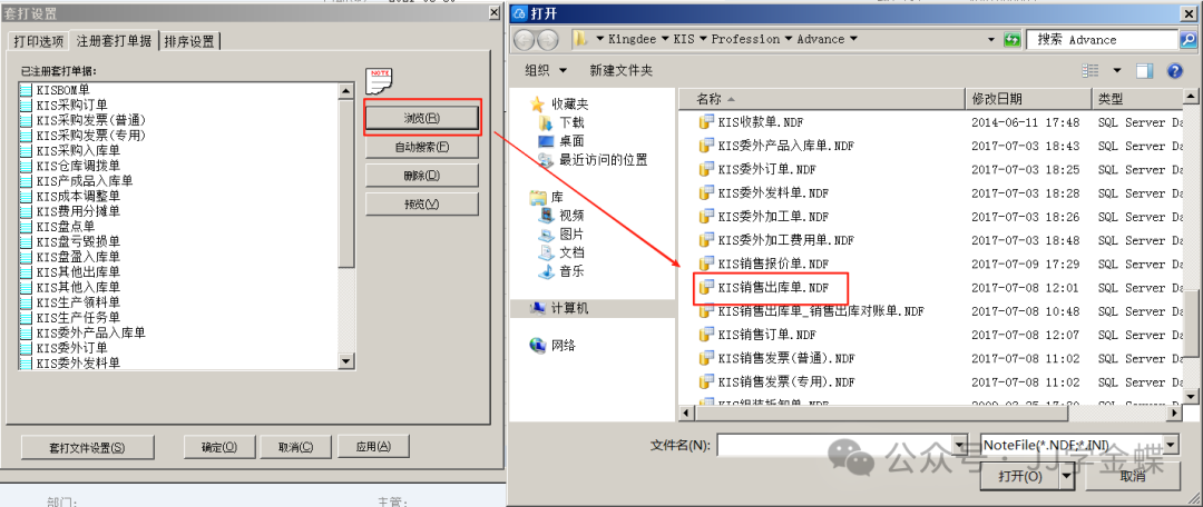 点击“套打设置”后,会弹出套打设置对话框。在对话框中,选中“注册套打单据”页面,点击“浏览”,找到套打文件存放的文件夹,选中套打文件后点击“打开”,此时套打文件即注册成功。