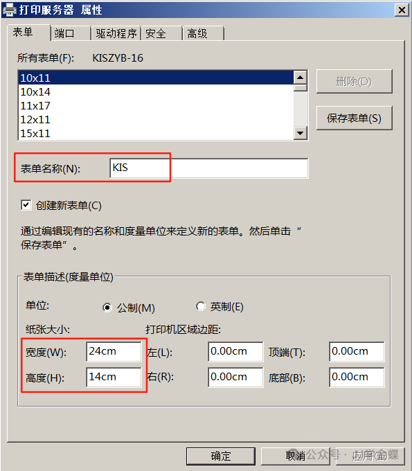 勾选“创建新表单(C)”然后在“表单名称(N)”输入对应名称,在“纸张大小”中输入宽度和高度尺寸,然后点击“确定”完成自定义纸张的添加。