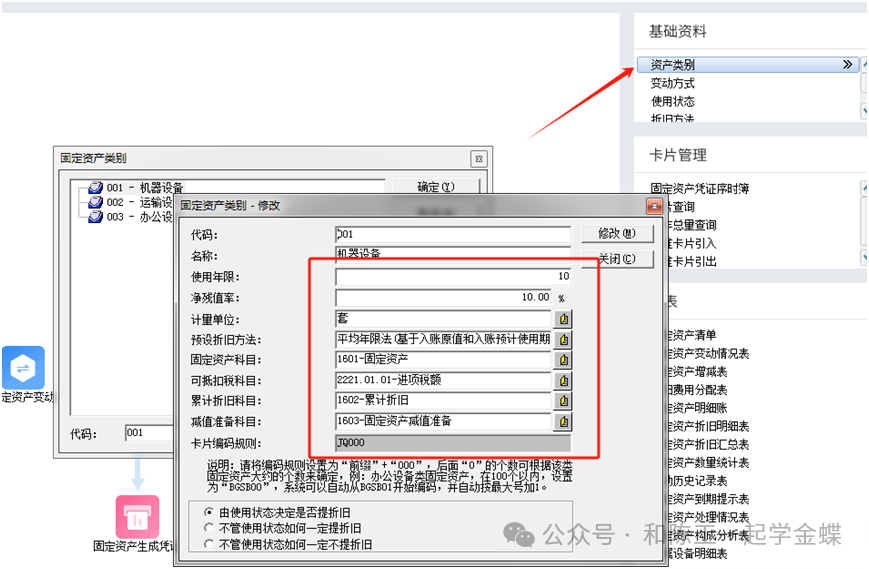 在录卡片之前首先要设置一些参数,右上角,最重要的参数则是资产类别:使用期间,残值率,对应的会计科目及编码原则等,如图