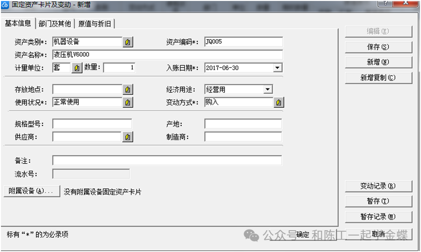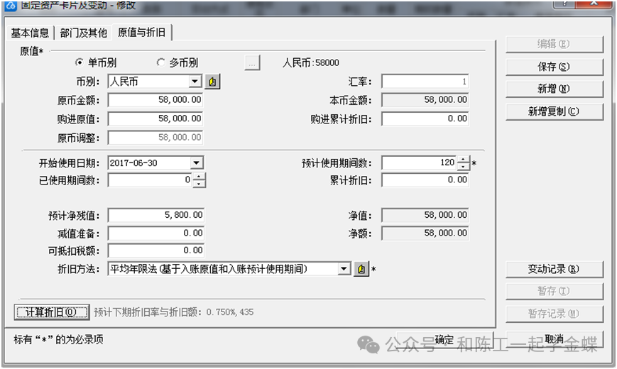 第三个界面是最重要的:购买原值,开始使用日期,预计使用月份,及对应的折旧方法,点右上角的保存后,再点计算折旧,就会算出以后每个月会折旧多少金额,最后点下面的确定,一张卡片就录完了。