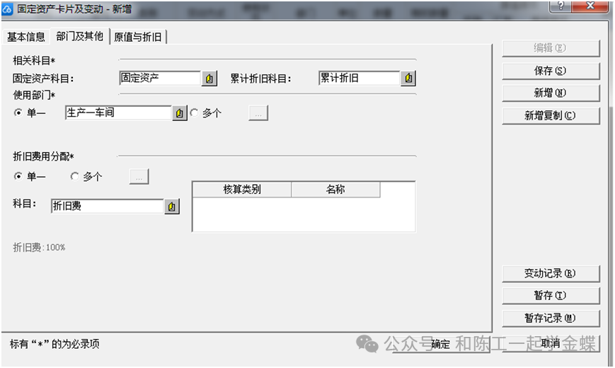 第二个界面:固定资产及累计折旧和折旧费用各对应财务会计科目,以及使用部门