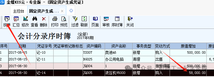 进入主界面,点固定资产生成凭证,就会过滤出当月新增的卡片,选择要生成凭证的卡片,左上角可以按单(一张卡片生成一张凭证),也可以汇总(多张卡片生成一张汇总凭证),然后会弹出凭证,借方默认是固定资产,贷方科目是现金银行还是应付账款,手工补上再点保存凭证。