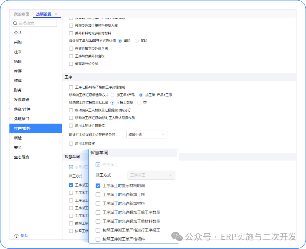 2 支持设置是否根据工序领料。工序派工时,可通过选项设置工序派工时是否显示材料明细以及是否需要按工序领料